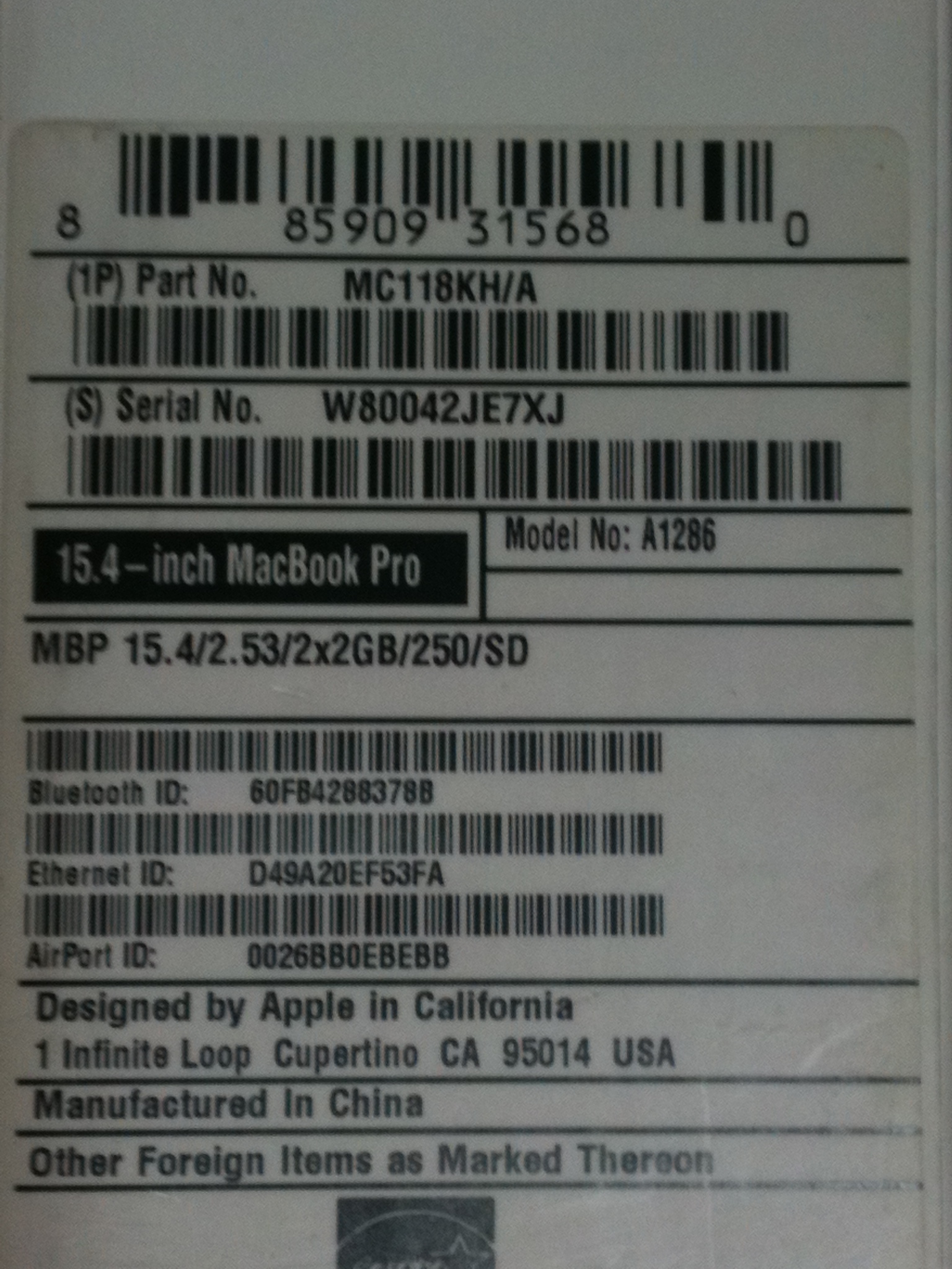 Intel(R) Core(TM)2 Duo CPU 2.53GHz / 메모리 4.00GB / 하드디스크 250GB / NVIDIA GeForce 9400M(박스는 있는데